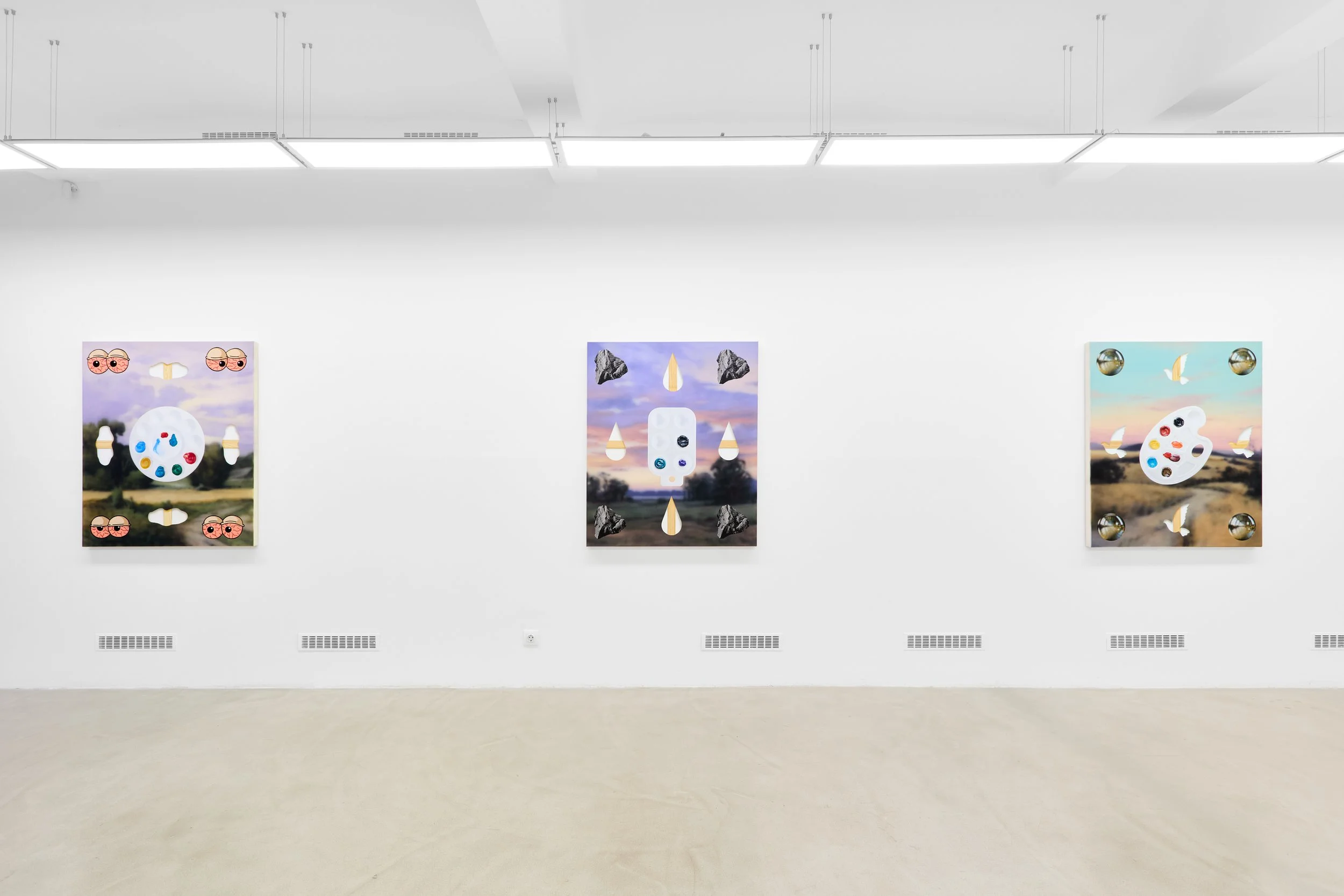 Paul Riedmüller's paintings are easy to identify with, as he places everyday elements in an artificial environment, creating a hybrid province, a representation of online and real space. Riedmüller's work goes beyond the representation of digital phenomena in and through painting into another medium, and is more about our perception of reality as altered by technology. The new spectral reality of the 'virtual village', which generates continuous pulses, is made familiar and experienced by displays. In effect, he uses the space of images to outline the visual culture that influences our present, thus defining his creative language. In this way, the painter makes his visual world comprehensible, leaving us with the challenge of deciphering and interpreting the constellation of familiar components he has created. The different layers of his paintings are the result of a complex process, collage compositions created with artificial image generators and a manual creative process. From found footage, he uses a sea of visual elements to create his collage compositions, which he then paints, reversing his digital image-making process. His paintings question our traditional visual consumption in a humorous and playful way. The surface of his works is shaped in an eye-deceiving way. He uses the most obvious form of representation, the trompe-l'œil, to capture the increasingly relative way in which we experience reality and painting's constant attempt to renew itself. In the context of digital deceptions (such as CGI and deepfake), it also serves as an appropriate proxy for the artist's investigation into the relationship between image and reality. Paul Riedmüller's works manipulatively simulate perspective, light and space, which act as an optical puzzle projected onto a plane.