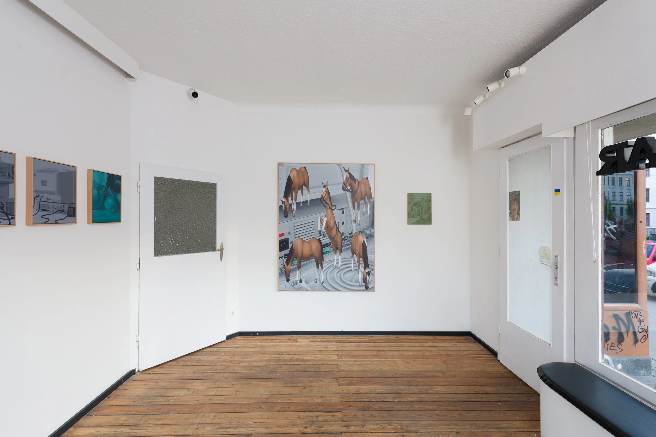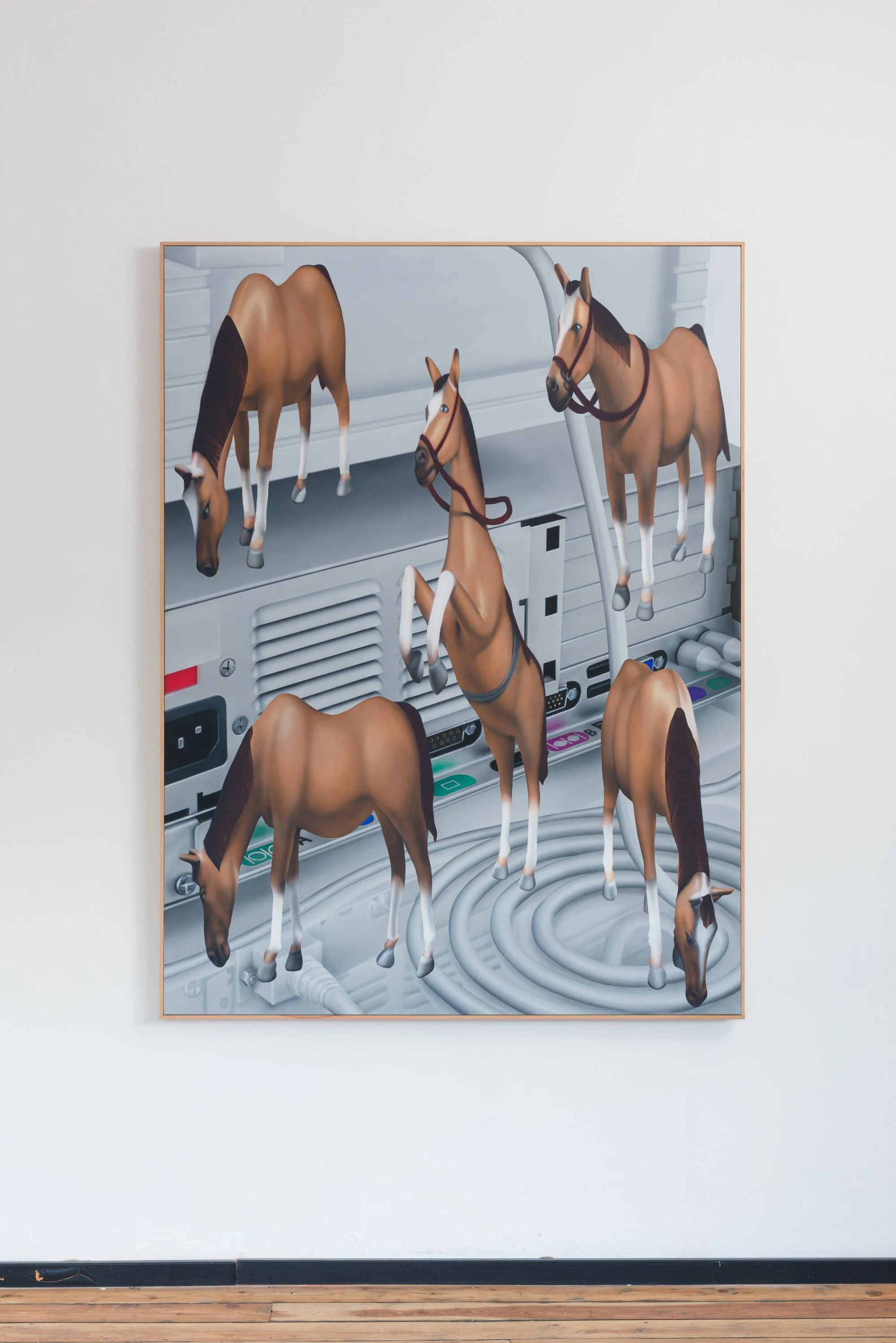 The same is true for his other painting Pferde (Horses). While funky mares and stallions populate the scene, the title keeps its promise: The beauty of those animals, their perfect poses, the ease of their color’s application… and again, this feeling of nostalgia. School yard trading, ponies, Wendy. Gracing peacefully in this Silicon Valley, these mounts look like straight out of a fairytale, their fur glittering and perfectly surreal in the cold grey of its surrounding. What makes this scene so bewildering is not the subjects of its content, but how they are presented. Like stickers in an album of collectibles, these horses are floating in the midst of air, while others seem to be grounded by gravity. Through the lack of any shadowing, one thing becomes apparent: there is a certain beauty in it, lightness even, that one can not ignore. Horses is not about horses at all. It is about playfulness, fantasy and how we see the world. It is about the possibility of everything in a world of art and imagination.