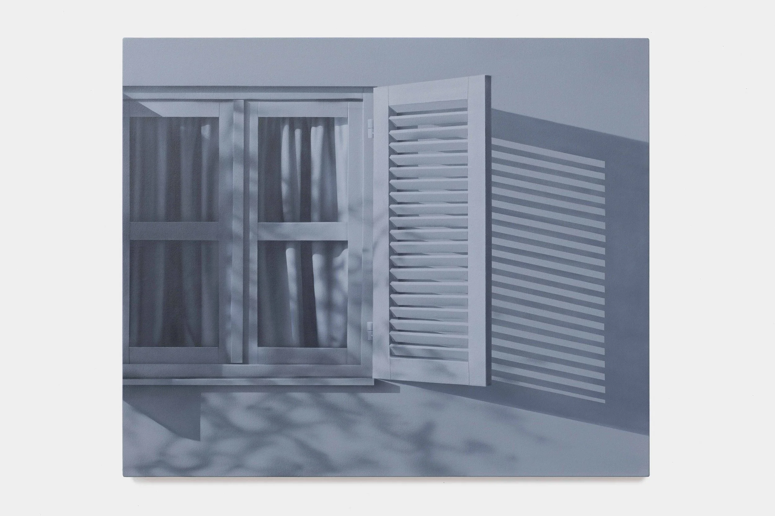 The exhibition also challenges conventional modes of display. Riedmüller integrates articulated structures that bring the paintings off the wall and into the gallery space. A central feature is a freestanding wall with paintings of Mallorcan windows on both sides. These works blur the line between painting and sculpture, evoking architecture and suggesting a building within the gallery. This gesture opens a dialogue between interior and exterior, between what is seen and what is imagined—touching on a central concern in Riedmüller’s practice: how we construct and inhabit visual reality.